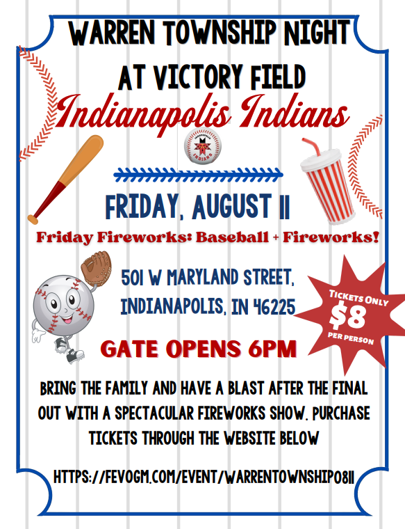 I am excited to share that Friday, August 11th is Warren Family Night at the Indianapolis Indians game downtown at Victory Field. This event is for all students, families, and staff. Tickets are just $8 for lawn seats. This will be a great evening to show off our Warren pride, watch some great baseball and take in the fireworks show after the game. Tickets can be purchased by visiting the website or using the QR code on the attached flyers.